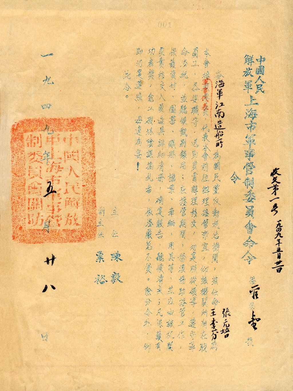 1949年5月上海,1949年5月28日,中國(guó)人民解放軍上海市軍事管制委員會(huì)發(fā)布第一號(hào)“軍管令”,即接管海軍江南造船所。