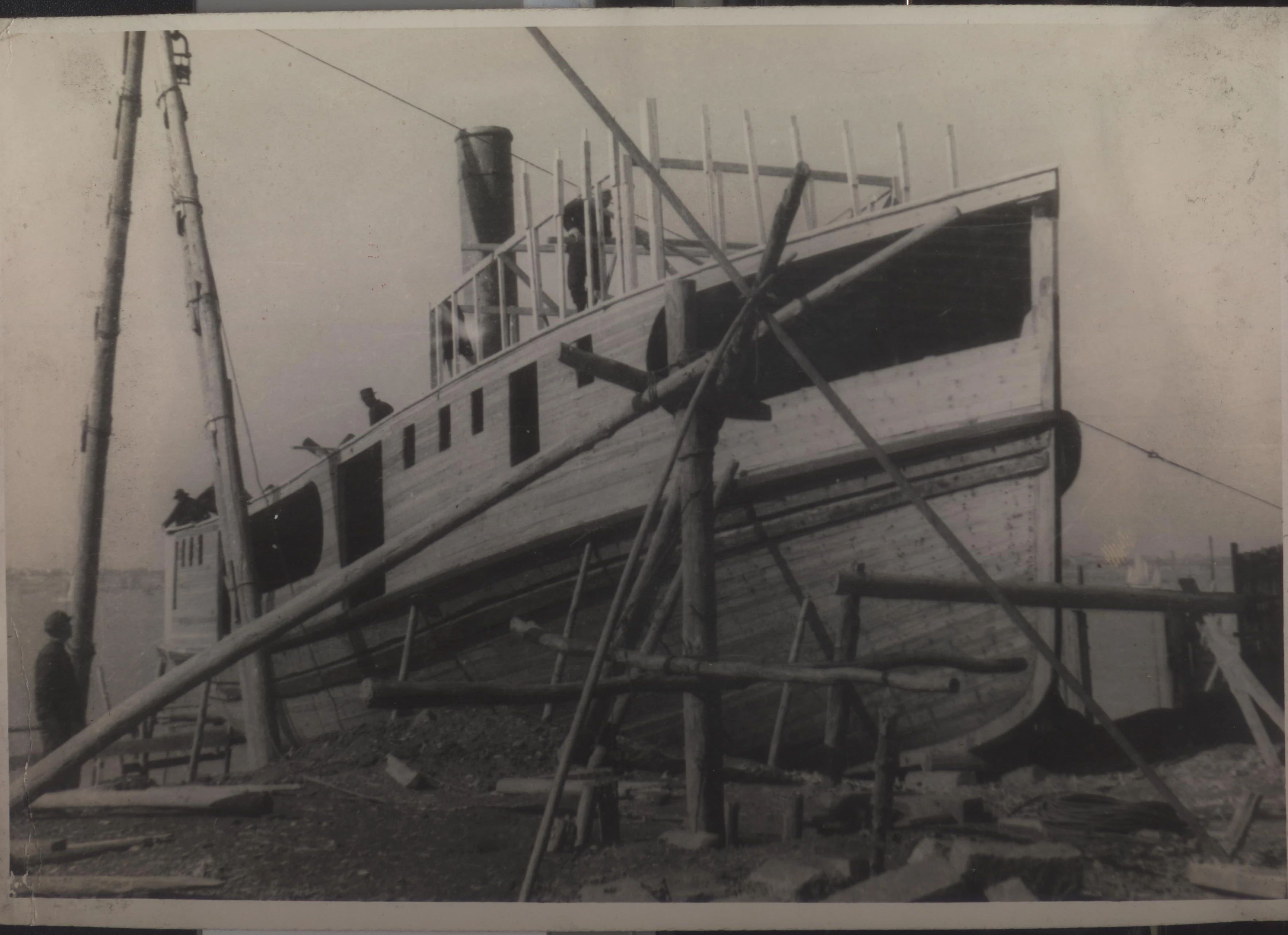1934年武漢,上世紀(jì)30年代,武昌造船成立之初,工人們以手工作業(yè)“敲敲打打”形式開展修造船業(yè)務(wù)。修造的船只大多為100~300噸、鋼肋骨與木殼結(jié)構(gòu),僅有少量是鋼鉚接船體。建造的船只只能在長(zhǎng)江上航行跑跑運(yùn)輸。為了生存和救國(guó),船廠還建造一些農(nóng)用機(jī)械器具、槍支,以輔助民生、支援抗日。