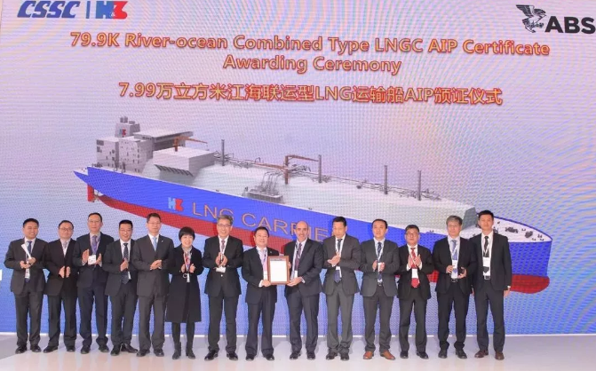 ????中國船舶集團所屬滬東中華造船(集團)有限公司推出了包括LNG-FSRU船、ARC7破冰型LNG船、350MV LNG發(fā)電船、V2.0版18600立方米LNG加注船在內(nèi)的6款新船為中國船舶集團代言。12月4日,滬東中華獲得了由美國船級社頒發(fā)的全球首例7.99萬立方米江海聯(lián)運型LNG船AiP證書、由DNV GL船級社頒發(fā)的全球最大25000TEU集裝箱船AiP證書。
