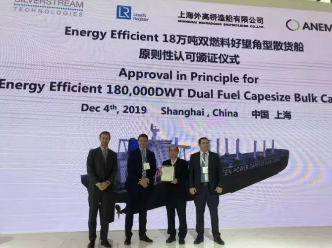 ????12月4日,中國船舶集團所屬上海外高橋造船有限公司隆重推出兩款集多種節(jié)能環(huán)保技術于一身的“Energy Efficient”18萬噸級雙燃料好望角型散貨船和30萬噸級雙燃料超大型原油船新船型。展會上,英國勞氏船級社為18萬噸級雙燃料好望角型散貨船頒發(fā)了AiP證書;英國勞氏船級社和美國船級社為30萬噸級雙燃料超大型原油船頒發(fā)了AiP證書。