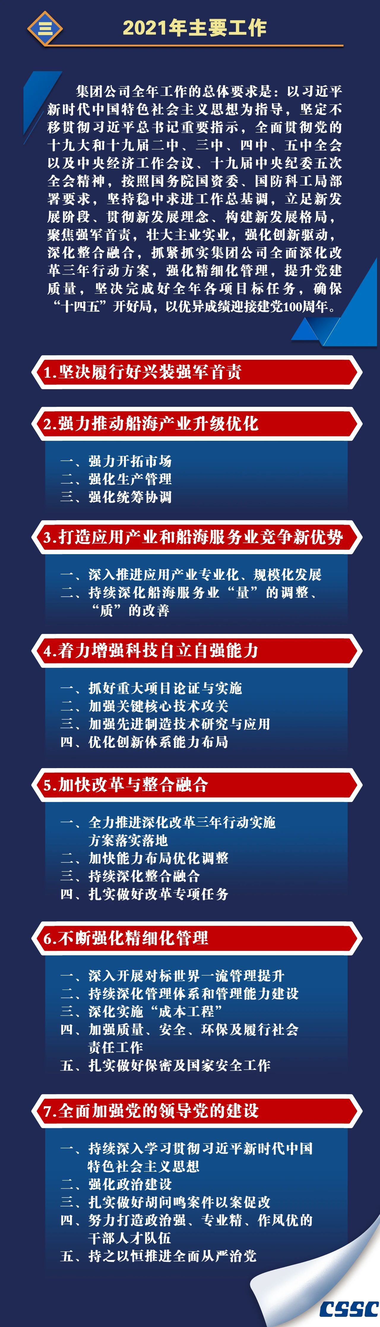 1月27日,在中國船舶集團(tuán)有限公司2021年度工作會(huì)議上,中國船舶集團(tuán)黨組書記、董事長雷凡培作了題為《貫徹新發(fā)展理念 強(qiáng)化精細(xì)化管理 為加快建設(shè)世界一流船舶集團(tuán)不懈奮斗》的工作報(bào)告。
