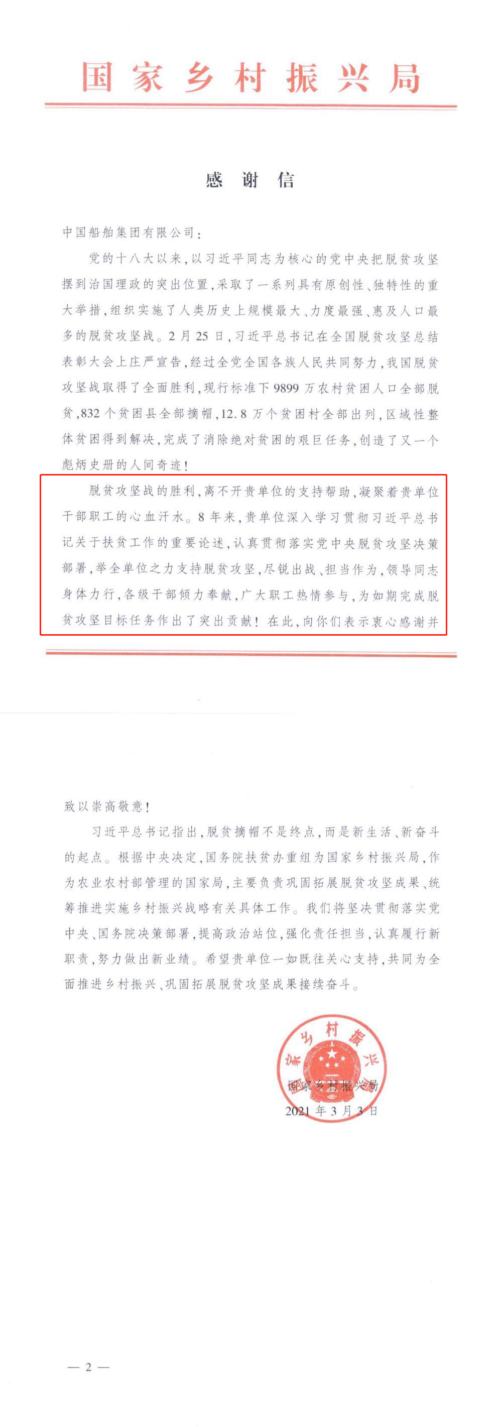 日前,中國船舶集團收到一封特殊的感謝信。信中對中國船舶集團8年來的擔(dān)當(dāng)作為、傾情奉獻表示感謝和敬意,這封信來自不久前剛剛掛牌的國家鄉(xiāng)村振興局。