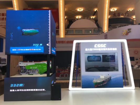 進(jìn)入中國船舶展廳,觀眾不僅能夠看到“奮斗者”號全海深載人潛水器、“雪龍2”號極地科考船等多個高科技品牌產(chǎn)品,還可以通過航空母艦、常規(guī)動力潛艇、驅(qū)逐艦、護(hù)衛(wèi)艦?zāi)P土私馕覈鴩姥b備實(shí)力。