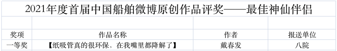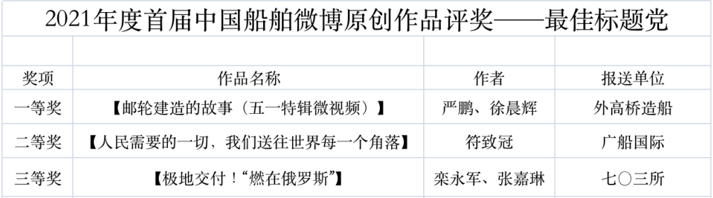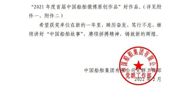 為鼓勵更多成員單位積極加入到中國船舶集團新媒體平臺的宣傳中來,在集團公司黨群工作部的指導(dǎo)下,中國船舶報社從不同維度,對2021年度各單位支持“中國船舶”微信的力度進行了梳理統(tǒng)計,并利用微博政務(wù)的全國專家?guī)煸u審資源,對2021年度“中國船舶”微博原創(chuàng)作品進行了專業(yè)評審,評選結(jié)果公布如下:
