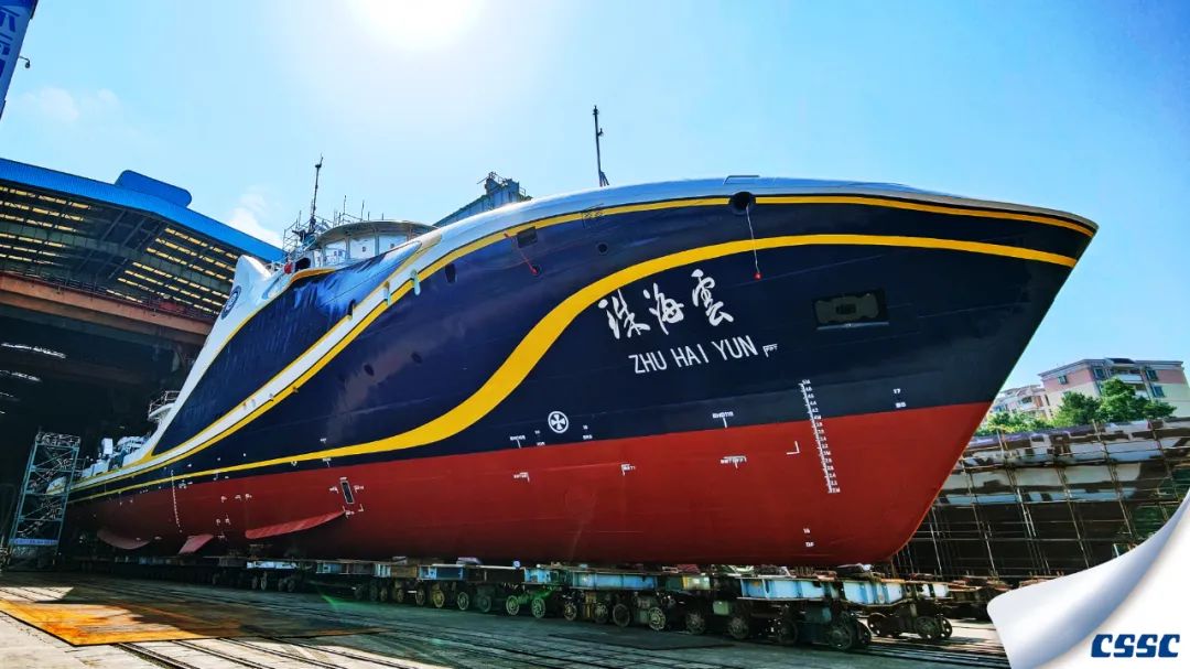 黃埔文沖建造的全球首艘智能型無(wú)人系統(tǒng)科考船“珠海云”號(hào)下水。這科幻的外表又似一頭巨大的鯨魚(yú)躍出海面。
