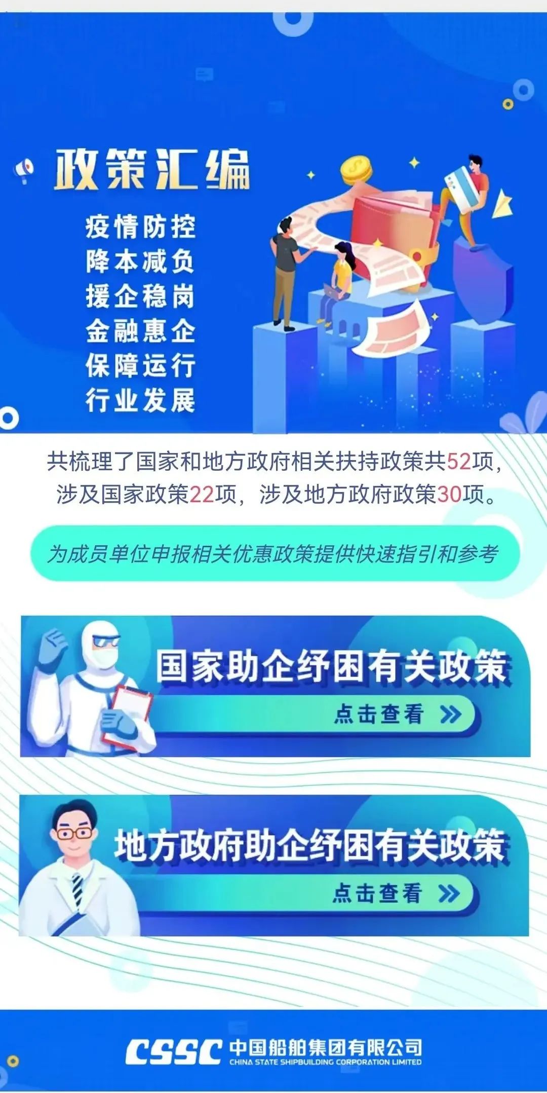 今年新冠疫情發(fā)生以來,為支持企業(yè)應(yīng)對疫情防控、加快復(fù)工達(dá)產(chǎn),國務(wù)院、相關(guān)部門、相關(guān)地方政府出臺了一系列助企紓困政策。集團(tuán)公司對這些政策進(jìn)行了梳理,共涉及相關(guān)支持政策52項(其中,國家支持政策22項地方支持政策30項),供成員單位查閱參考。