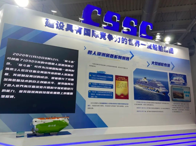在重大科技專項工程展區(qū),中國船舶集團(tuán)集中展示了在深??茖W(xué)研究和海洋資源開發(fā)領(lǐng)域深化實施的“蛟龍”號、“深海勇士”號、“奮斗者”號三型載人深潛裝備等一批重大科技專項工程,以及取得的突破性、標(biāo)志性的成果。其中,展會現(xiàn)場展示的“奮斗者”號創(chuàng)造了10909米的中國載人深潛深度紀(jì)錄。
