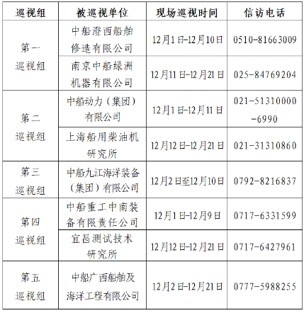 根據(jù)中國船舶集團(tuán)黨組2022年第二輪巡視工作部署,截至2022年12月2日,中國船舶集團(tuán)黨組5個(gè)巡視組已進(jìn)駐中船澄西船舶修造有限公司、中船動(dòng)力(集團(tuán))有限公司、中船九江海洋裝備(集團(tuán))有限公司、中船重工中南裝備有限責(zé)任公司、中船廣西船舶及海洋工程有限公司等單位,開展為期20天左右的巡視“回頭看”。巡視期間,巡視組設(shè)置專門值班電話(具體如下表),同時(shí)在巡視組工作現(xiàn)場設(shè)置聯(lián)系信箱,廣大干部職工可以反映情況。