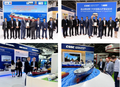 開展當(dāng)天,中國船舶集團展臺舉辦了隆重的商務(wù)活動,滬東中華27.1萬立方米LNG船獲得ABS船級社認(rèn)可證書、江南造船自主研發(fā)第二代B型艙獲得AIP頒證、中船澄西裝備公司與印尼客戶簽署108臺40英尺LNG罐箱項目框架合同。現(xiàn)場熱烈的氣氛吸引了眾多國際船東、船級社、設(shè)備廠商等到訪觀摩,與參展成員單位交流了當(dāng)前市場熱點并探討了未來合作機遇。