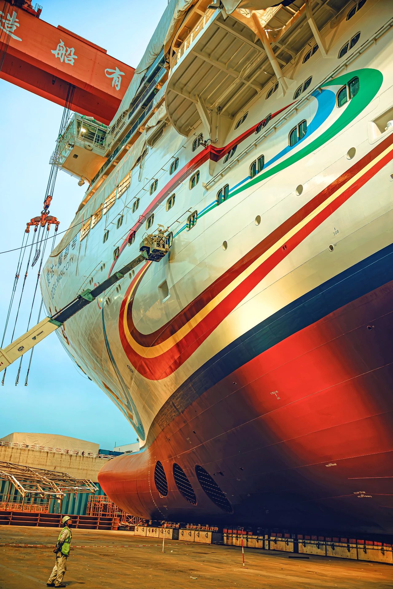 照片攝于國產(chǎn)首艘大型郵輪首次出塢前夕,拍攝時期為傍晚,船塢開啟燈光照明,工人在對船身做最后的涂裝修飾工作。這樣的角度觀看國產(chǎn)首艘大型郵輪令人無比震撼。