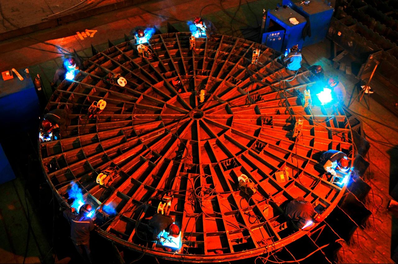 該作品反映的是造船工人在車間里焊接分段的場面。為了保證焊接件不受熱脹冷縮的影響而變形,需要十幾個工人從不同角度同時不間斷焊接,有時連續(xù)工作十幾個小時,直至焊接件全部完成。在這不是戰(zhàn)場勝似戰(zhàn)場的車間里,每一名工人都在聚精會神地激戰(zhàn)著。