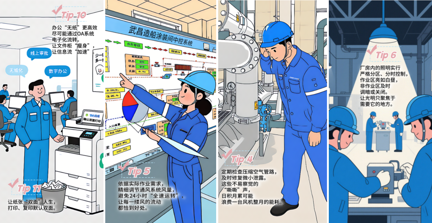 武昌造船在節(jié)能宣傳周期間組織開展了“船廠節(jié)能秘籍”征集活動,以船廠員工的一天為軸線,收集到各類節(jié)能基本操作,形成了《這些基本操作,我知道你一定能做到》宣傳材料,并通過公司公眾號發(fā)布,向員工普及節(jié)能知識與技巧,擴(kuò)大節(jié)能宣傳覆蓋面。同時開展 “停用空調(diào)”能源緊缺體驗(yàn)行動,倡議全體員工在全國低碳日,關(guān)閉辦公室、會議室及非必要區(qū)域空調(diào)設(shè)備,通過實(shí)際行動感受能源緊缺,踐行節(jié)能理念,進(jìn)一步增強(qiáng)員工資源憂患意識。