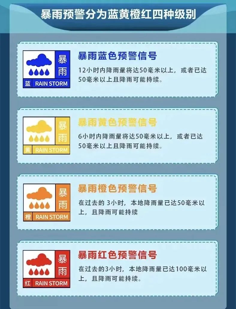 暴雨預(yù)警信號(hào)是氣象部門通過氣象監(jiān)測(cè),在暴雨到來之前做出的預(yù)警信號(hào),暴雨預(yù)警信號(hào)分四級(jí),分別以藍(lán)色、黃色、橙色、紅色表示。