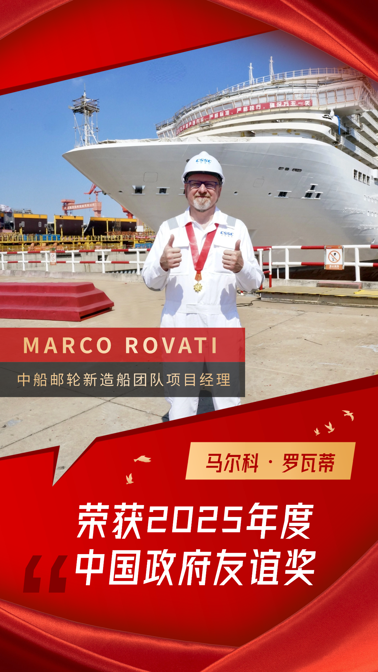MARCO ROVATI是一位出生于1967年的克羅地亞籍郵輪工程專家,擁有超過三十年的郵輪新造船經(jīng)驗。在獲得中國政府友誼獎后,MARCO ROVATI說:“中國政府友誼獎是我職業(yè)生涯中獲得的最重要的榮譽,對我而言具有非凡意義。這份獎項不僅是對我過去工作的認可,更是對我未來的激勵。我將繼續(xù)為中國郵輪產(chǎn)業(yè)的發(fā)展貢獻自己的力量?!?/p>
