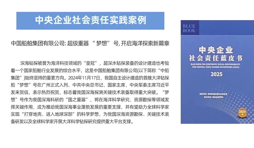 中船集團申報的《超級重器“夢想”號,開啟海洋探索新篇章》,聚焦國之重器建造歷程,闡述了“夢想”號在海洋科學(xué)研究、深海資源勘探等領(lǐng)域的關(guān)鍵作用,成功入選《中央企業(yè)社會責(zé)任藍皮書(2025)》中央企業(yè)社會責(zé)任實踐案例。