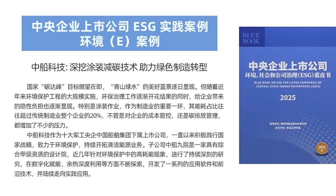 中船集團旗下上市公司中船科技申報的《深挖涂裝減碳技術(shù) 助力綠色制造轉(zhuǎn)型》,聚焦環(huán)保治理工作,以技術(shù)創(chuàng)新助力產(chǎn)業(yè)轉(zhuǎn)型,為行業(yè)綠色發(fā)展提供了實踐示范,成功入選《中央企業(yè)上市公司環(huán)境、社會和公司治理(ESG)藍皮書(2025)》環(huán)境(E)案例。