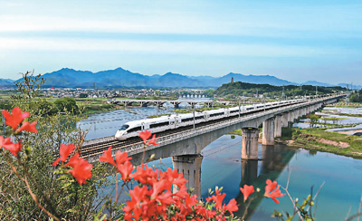 4月14日,一列動(dòng)車穿行“中國(guó)最美高鐵”合福線新安江休寧古城巖大橋。徐 明攝(人民視覺(jué))