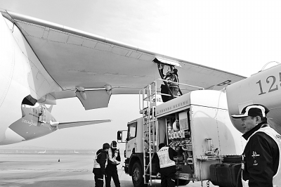 11月21日,在北京首都國際機場,工作人員為海南航空HU497航班的波音787客機加注生物航煤。(新華社發(fā))