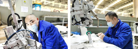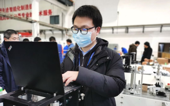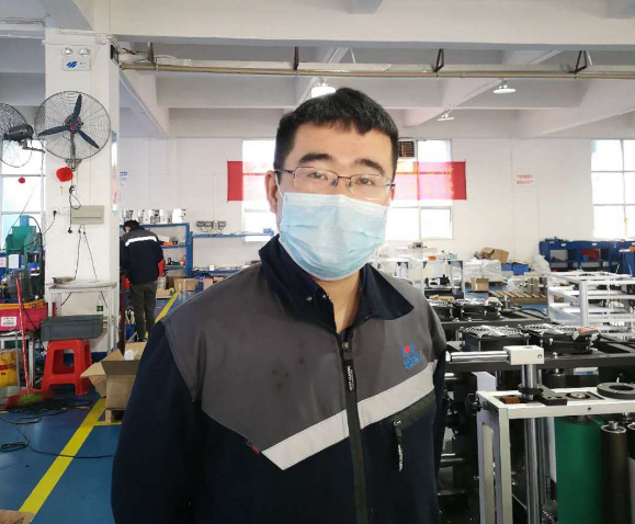 ????徐存培是平面口罩機(jī)項(xiàng)目的技術(shù)負(fù)責(zé)人。自接到平面口罩機(jī)研制任務(wù)以來,他幾乎就“長”在公司里了。他穿梭在各臺(tái)平面口罩機(jī)間,一會(huì)兒墊腳測量放料架距離地面的高度,一會(huì)兒彎腰擰緊設(shè)備柜里的螺絲,一會(huì)兒又緊盯著傳送帶,看無紡布貼合的角度是否精準(zhǔn)無誤……