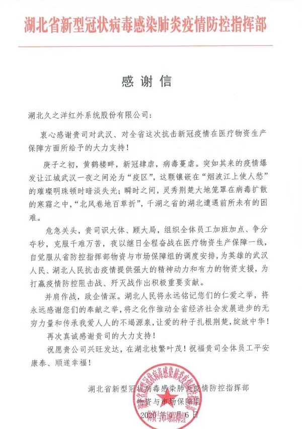 ????信中,對中國船舶集團(tuán)七一七所所屬湖北久之洋紅外系統(tǒng)股份有限公司在抗擊新冠肺炎疫情工作中,在醫(yī)療物資生產(chǎn)保障方面給予的大力支持表示感謝。