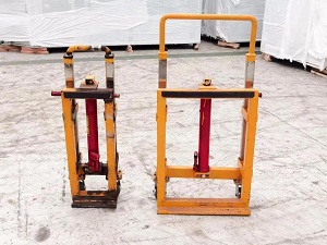 △ 左圖為運(yùn)輸液壓小車(chē),右圖為工人正在操作小車(chē)運(yùn)輸。