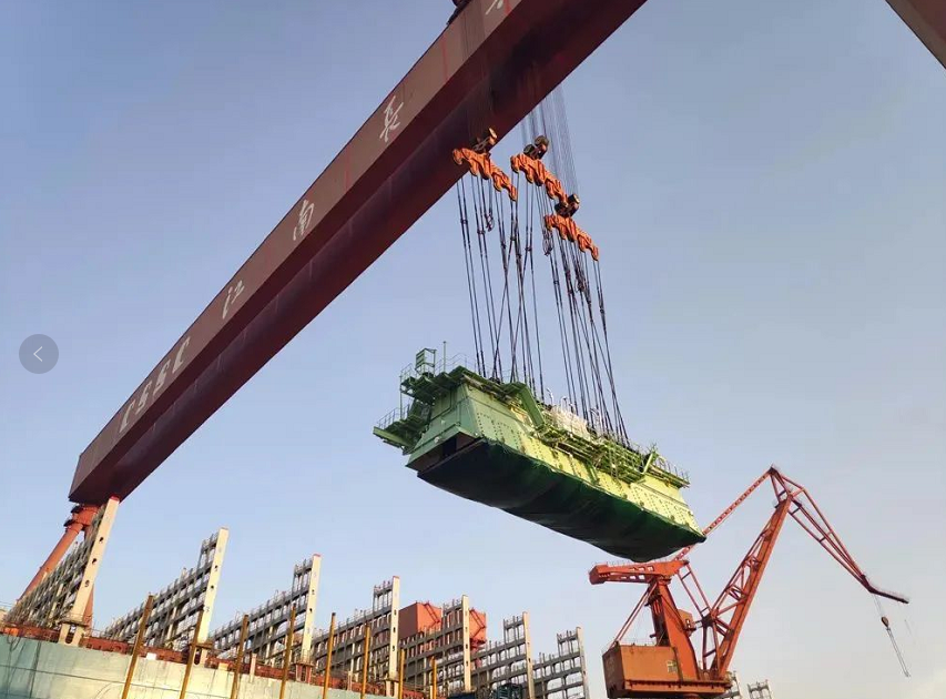 ????日前,中國船舶集團旗下滬東中華順利完成23000TEU集裝箱船3號船的主機吊裝工作,標志著該船向出塢邁出最關(guān)鍵一步。主機吊裝整個過程用時不到5天,同時取得僅用2.5天就完成5大件吊裝的新突破,為同行業(yè)系列船最短紀錄。