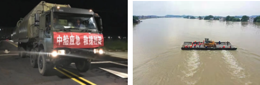 △ 中船應(yīng)急動(dòng)力舟橋正在運(yùn)輸大型工程裝備進(jìn)行抗洪搶險(xiǎn)