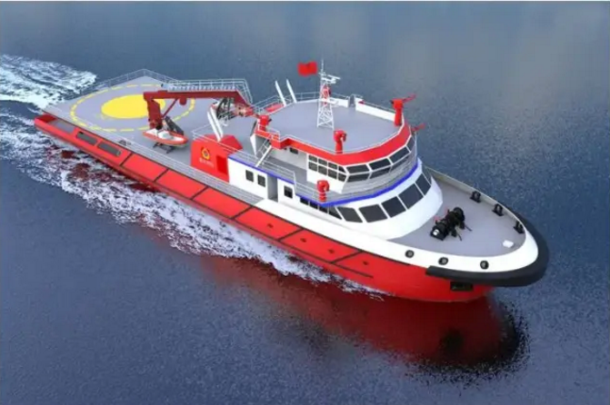 綜合救援消防船總長60米,配備電力推進系統(tǒng)和直升機平臺,對外消防能力達到內(nèi)河第3類消防等級。