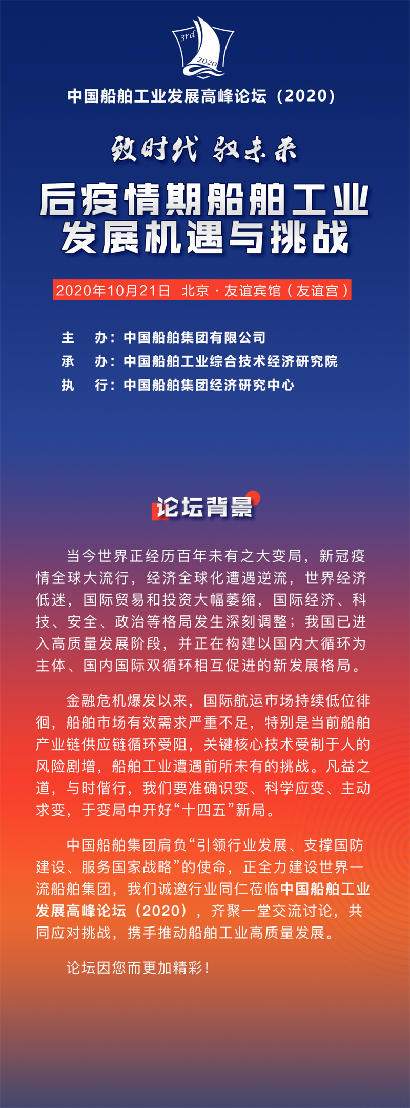 中國船舶集團(tuán)肩負(fù)“引領(lǐng)行業(yè)發(fā)展、支撐國防建設(shè)、服務(wù)國家戰(zhàn)略”的使命,正全力建設(shè)世界一流船舶集團(tuán),我們誠邀行業(yè)同仁蒞臨中國船舶工業(yè)發(fā)展高峰論壇(2020),齊聚一堂交流討論,共同應(yīng)對(duì)挑戰(zhàn),攜手推動(dòng)船舶工業(yè)高質(zhì)量發(fā)展。