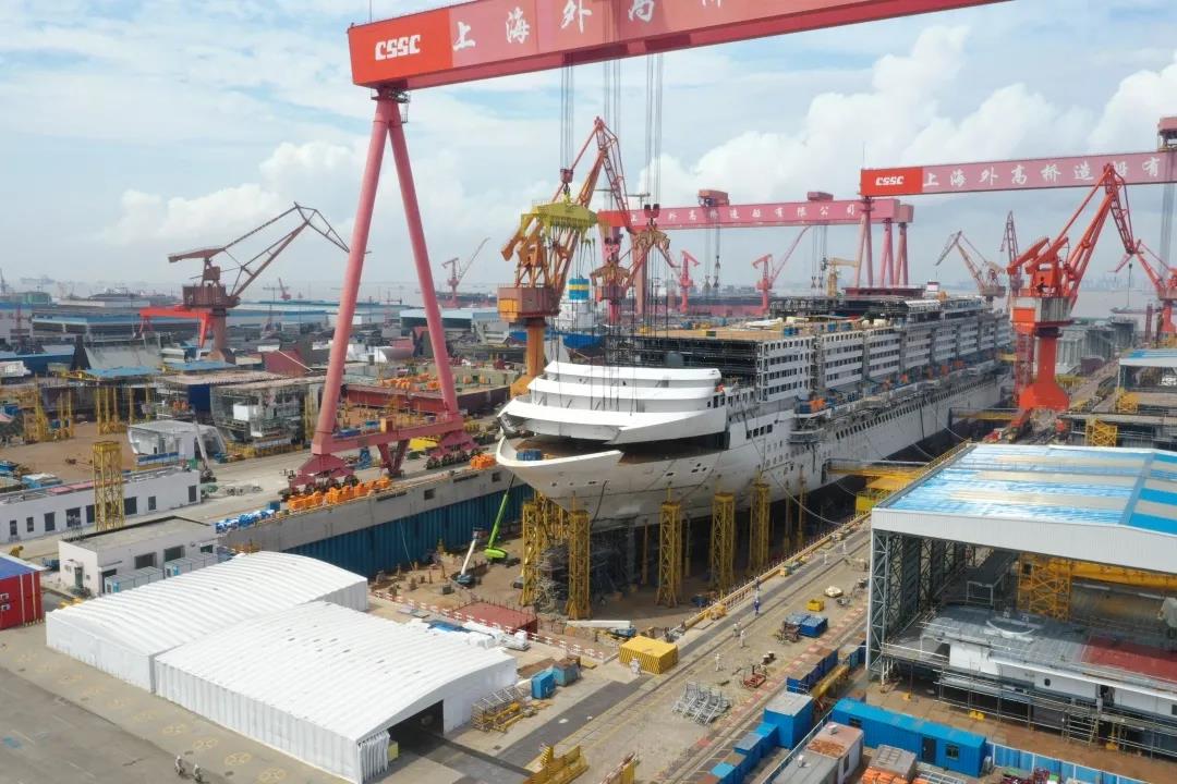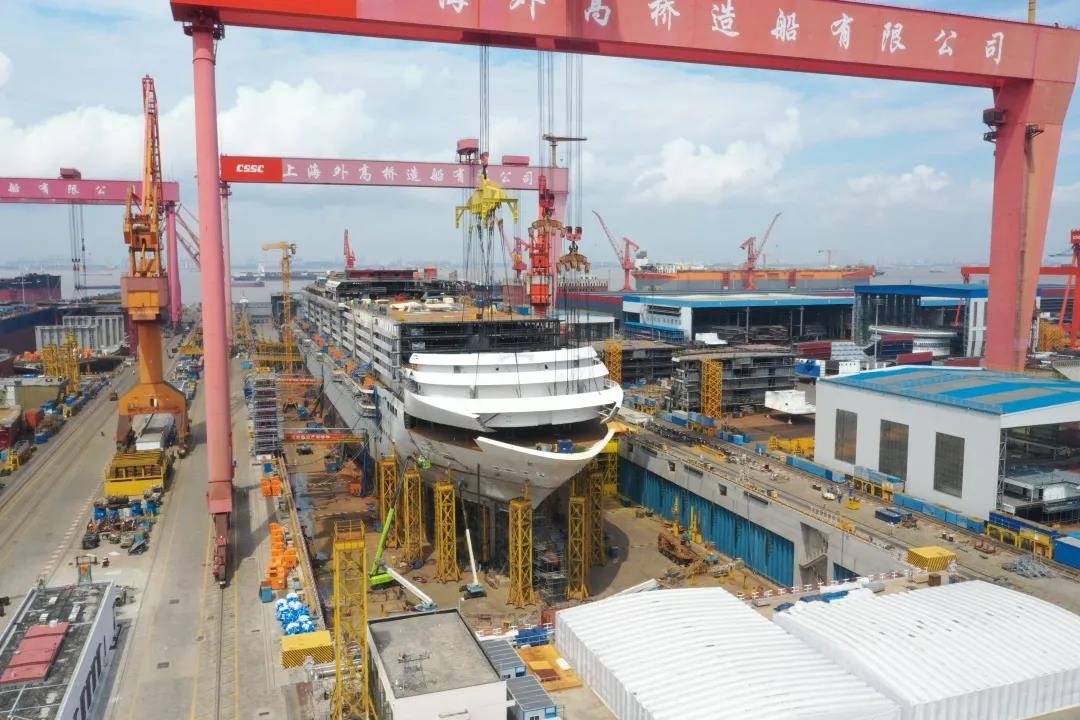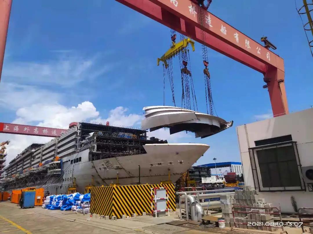 國產首制大型郵輪完成首個艏部總段吊裝! 預計9月實現(xiàn)全船結構貫通。