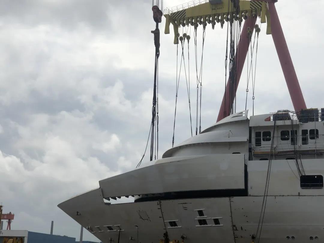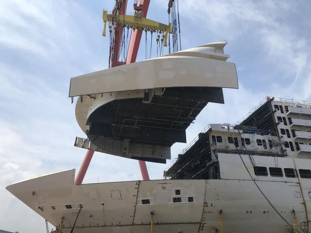 這標志著國產首制大型郵輪正式開啟艏部吊裝模式,9月份將實現(xiàn)全船結構貫通這一里程碑節(jié)點。