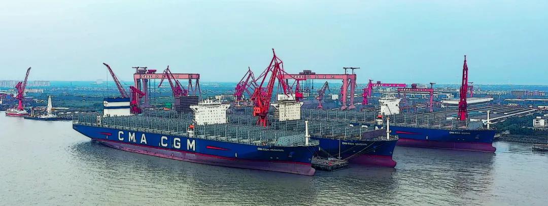 “海上綠巨人”系列箱船是滬東中華近期的重點產品。三艘15000TEU集裝箱船列隊整齊,滬東中華建造團隊開足馬力,奮戰(zhàn)金秋。該型號集裝箱船是當今世界綠色環(huán)保船型,國產化率達到90%,可靈活布置于全球各個重要航線。