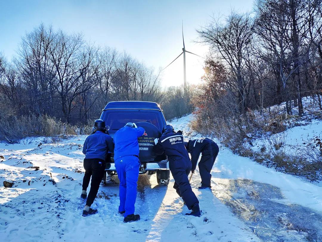 進(jìn)入11月,內(nèi)蒙古自治區(qū)錫林郭勒盟地區(qū)迎來大面積的暴風(fēng)雪,烏達(dá)萊項目人員在趕往風(fēng)場的路上遭遇積雪路段,雖然氣候嚴(yán)寒,但為了及時消除機(jī)組故障,大家在積雪路段采取挖雪推車的方式齊心協(xié)力,一同開展清理路面積雪的行動。這個冬日,冰雪阻擋不住海裝追風(fēng)者們勇往直前的步伐,他們只為恪盡職守完成一個承諾——風(fēng)機(jī)旋轉(zhuǎn)、帶來光熱。