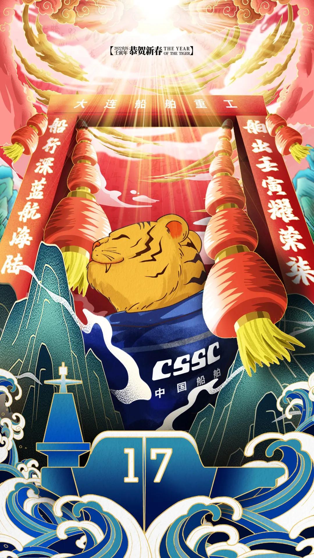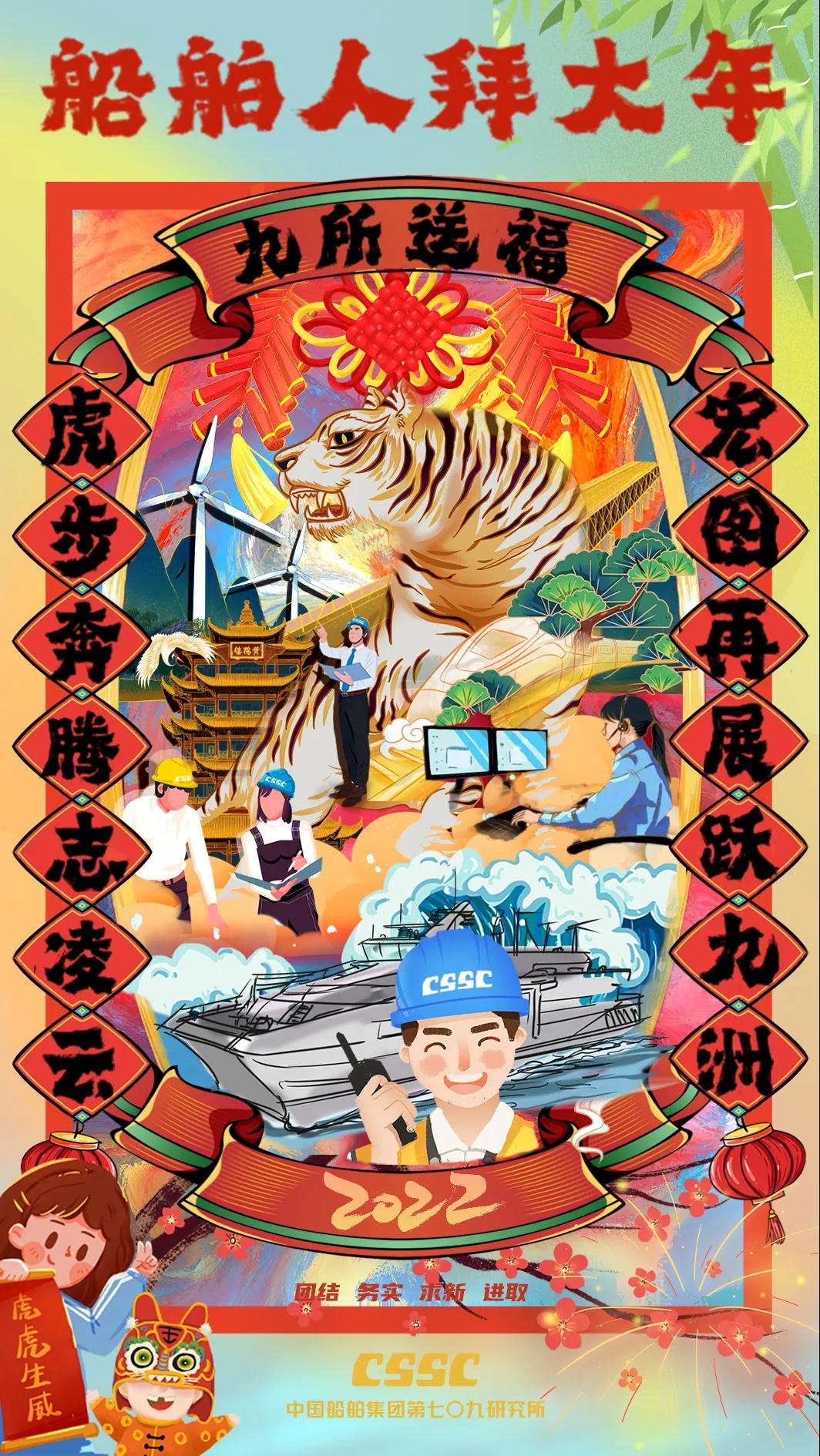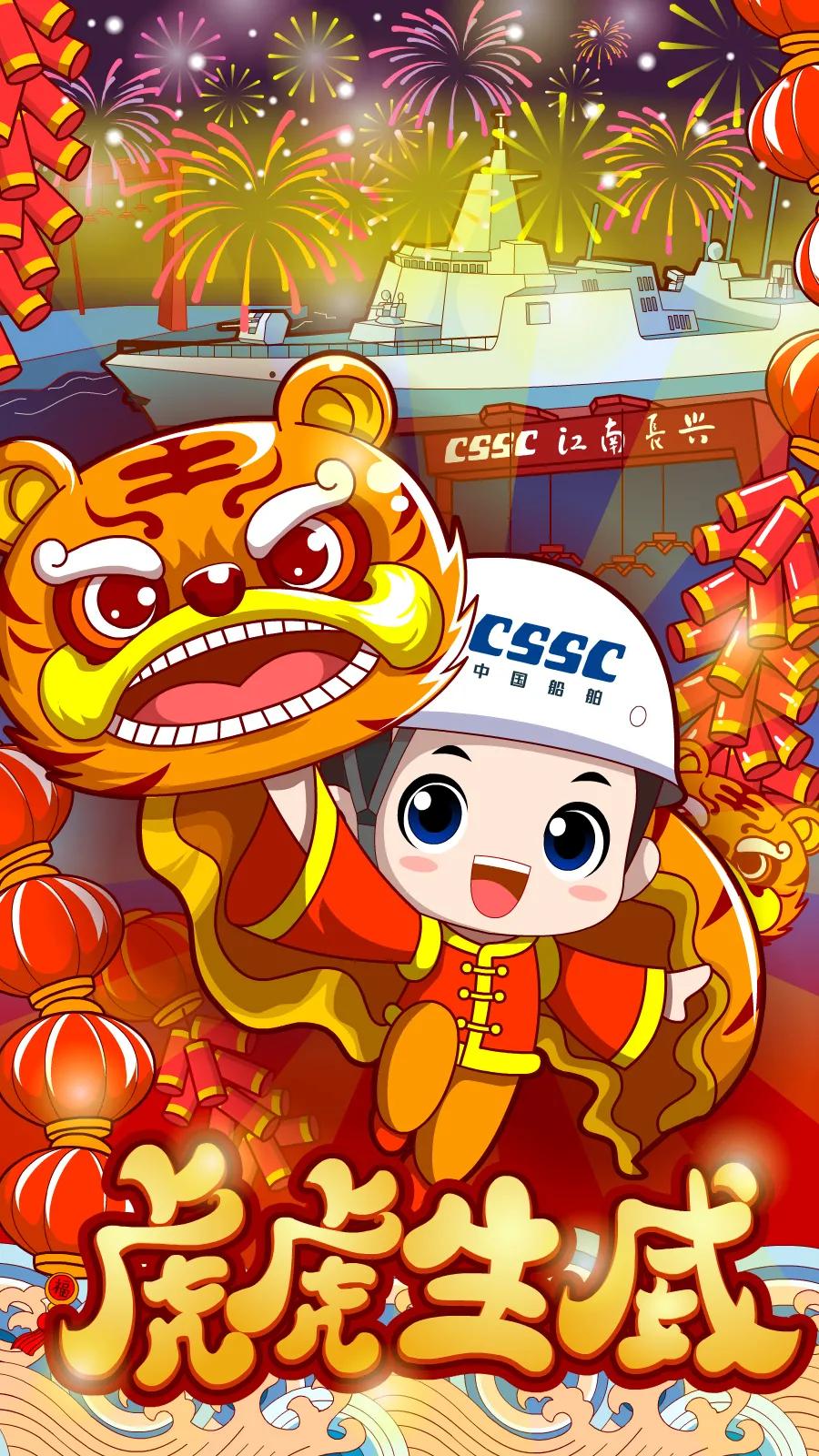 海報(bào)采用國(guó)潮畫風(fēng),中間部分“江小南”穿著新衣舉著虎頭,寓意新的一年中國(guó)船舶人虎虎生威,上面部分以重要產(chǎn)品和廠區(qū)設(shè)備為主,詮釋江南造船建造國(guó)之重器的初心和使命,同時(shí)輔以鞭炮、煙花、燈籠等新年元素,使海報(bào)充滿喜慶祥和的新年氛圍。