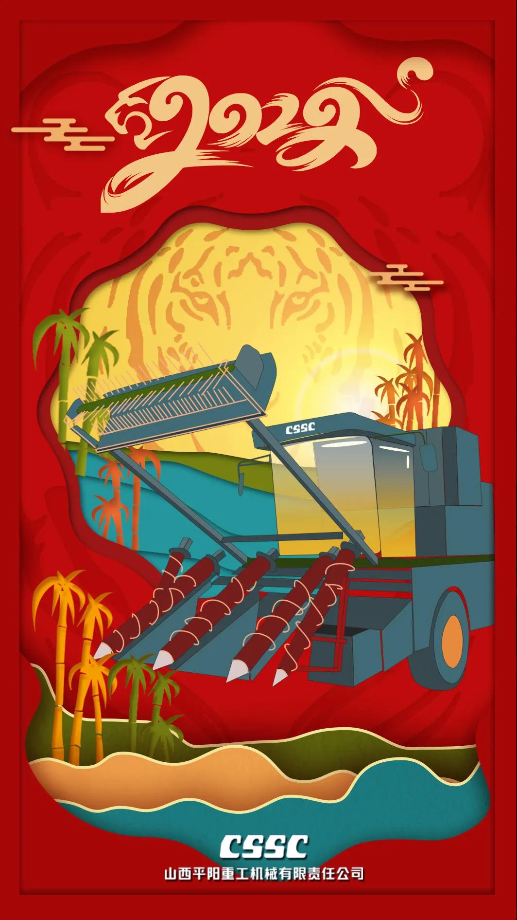 海報(bào)采用剪紙風(fēng)格,層層遞進(jìn)的縱深感傳遞著平陽(yáng)人不斷探索創(chuàng)新的拼搏精神;海報(bào)主體為平陽(yáng)重工新產(chǎn)品——甘蔗收獲機(jī),展示著平陽(yáng)風(fēng)采;海報(bào)以“虎紋”為背景,以紅色為主色調(diào),烘托出虎年的喜慶氛圍。