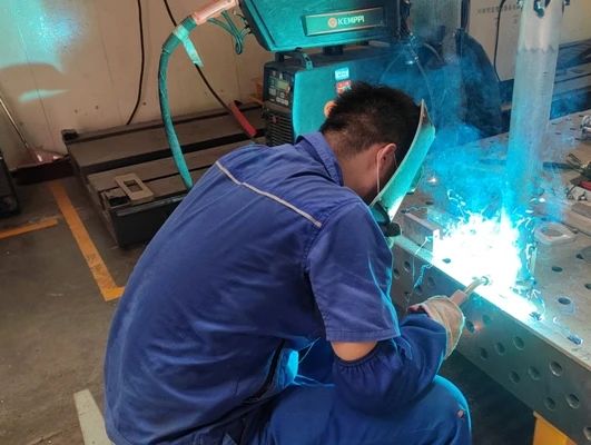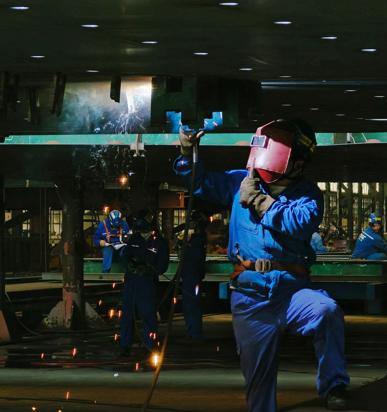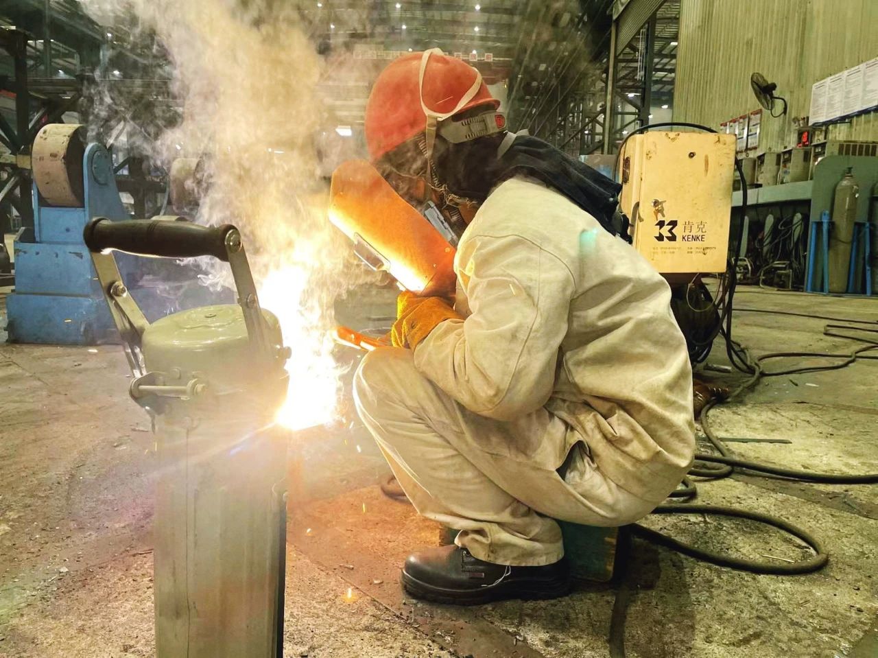 武漢船機(jī)——鋼構(gòu)制造部員工穿著厚厚的防護(hù)服進(jìn)行焊接工作。