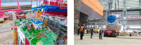 “夢(mèng)想”號(hào)配備的7臺(tái)推進(jìn)器中,3臺(tái)全回轉(zhuǎn)伸縮推是黃埔文沖迄今總成過(guò)的最大伸縮推,并且建造過(guò)程中伸縮推需要進(jìn)行全程升降試驗(yàn),升降高度差達(dá)4.3米。完成試驗(yàn)的伸縮推總段重量超過(guò)了船廠龍門(mén)吊最高900噸的起重能力?!皦?mèng)想”號(hào)工藝負(fù)責(zé)人馮仕清創(chuàng)新性地提出了采用龍門(mén)吊和履帶吊聯(lián)合吊裝的方法,最終保證了伸縮推的成功安裝。