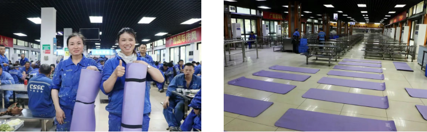 中午時分,走進廣船國際生產(chǎn)指揮樓食堂,十幾臺空調(diào)已經(jīng)提前開啟,食堂內(nèi)涼爽舒適。據(jù)介紹,該公司已經(jīng)將會議室、食堂等公共區(qū)域開放給一線員工作為午間的“休憩港灣”,讓一線員工得以安心小憩、恢復體力。13個食堂內(nèi),除了不銹鋼凳子、桌子可以供員工躺下休息之外,還為員工準備了瑜伽墊。