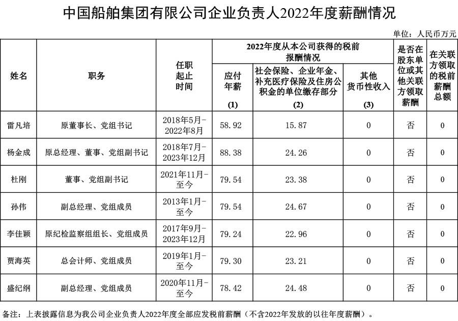 中國船舶集團(tuán)有限公司企業(yè)負(fù)責(zé)人2022年度薪酬情況
