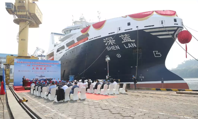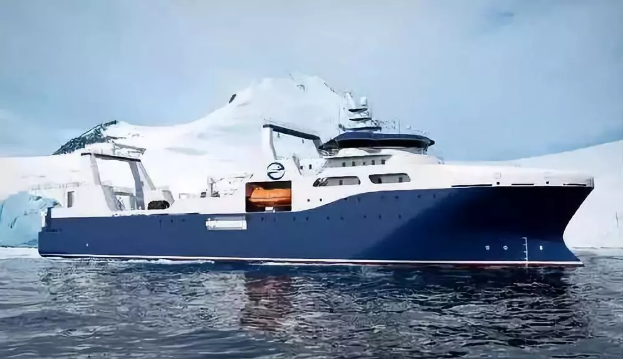 ????“深藍號”由黃埔文沖建造,七〇八所參與設(shè)計,總長約120米,型寬21.6米,設(shè)計吃水7.3米,設(shè)計航速15節(jié),主機功率8000 千瓦,載重噸約5000噸?!吧钏{號”是我國自主研制建造的第一艘漁業(yè)捕撈加工一體船,也是目前最大最先進的漁業(yè)捕撈加工一體船,取得近200項知識產(chǎn)權(quán)保護,實現(xiàn)了我國現(xiàn)代化漁業(yè)船舶裝備領(lǐng)域的重大突破,達到世界先進水平;主要用于南大洋漁業(yè)捕撈,兼顧海洋科考功能,可滿足ICE-A冰區(qū)(冰厚度0.8米)及-25℃低溫環(huán)境的營運要求。