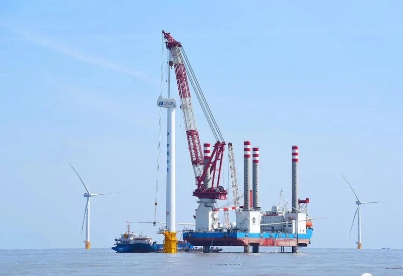 ????本次安裝難度大,30號風(fēng)機(jī)單葉片長73.5米,旋轉(zhuǎn)直徑達(dá)158米,輪轂高度81米。塔筒共分為底、中、頂三段,風(fēng)機(jī)整體總重量790噸以上,相當(dāng)于500余輛小汽車的重量?!罢窠枴逼脚_安裝3臺1800千瓦電力推進(jìn)全回轉(zhuǎn)舵槳,配備3臺750千瓦艏側(cè)推裝置。航速7節(jié),續(xù)航能力達(dá)3000海里,定員100人,平臺最大作業(yè)水深50米,甲板作業(yè)面積約2500平方米,可容納3套6兆瓦級風(fēng)機(jī)或2套8兆瓦級風(fēng)機(jī),并且可以獨立完成6兆瓦、8兆瓦級風(fēng)機(jī)的安裝和其他水上工程施工的起重、打樁、吊裝和運(yùn)輸?shù)茸鳂I(yè)。