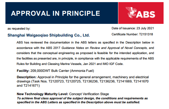 日前,中國船舶集團(tuán)旗下外高橋造船自主研發(fā)設(shè)計的21萬噸氨燃料動力散貨船獲得美國船級社(ABS)頒發(fā)的原則性認(rèn)可證書(AIP)。作為具有潛力的零碳燃料,氨燃料能滿足更加嚴(yán)格的溫室氣體排放要求,是未來脫碳航運業(yè)中最有希望的替代燃料之一。氨燃料動力船型的推出,為航運業(yè)提供一種零碳運輸?shù)沫h(huán)保新方案。