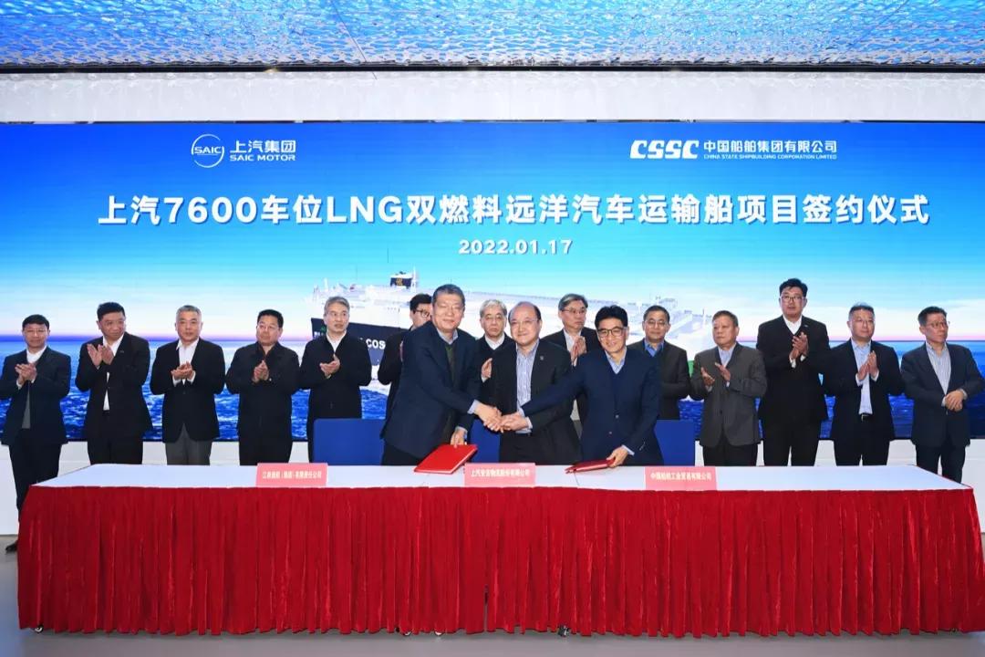 1月17日,中國船舶集團旗下江南造船攜手中船貿(mào)易與上汽集團旗下安吉物流簽訂2艘7600車位液化天然氣(LNG)雙燃料遠洋汽車運輸船建造合同。中國船舶集團黨組書記、董事長雷凡培,上汽集團黨委書記、董事長陳虹出席簽約儀式。
