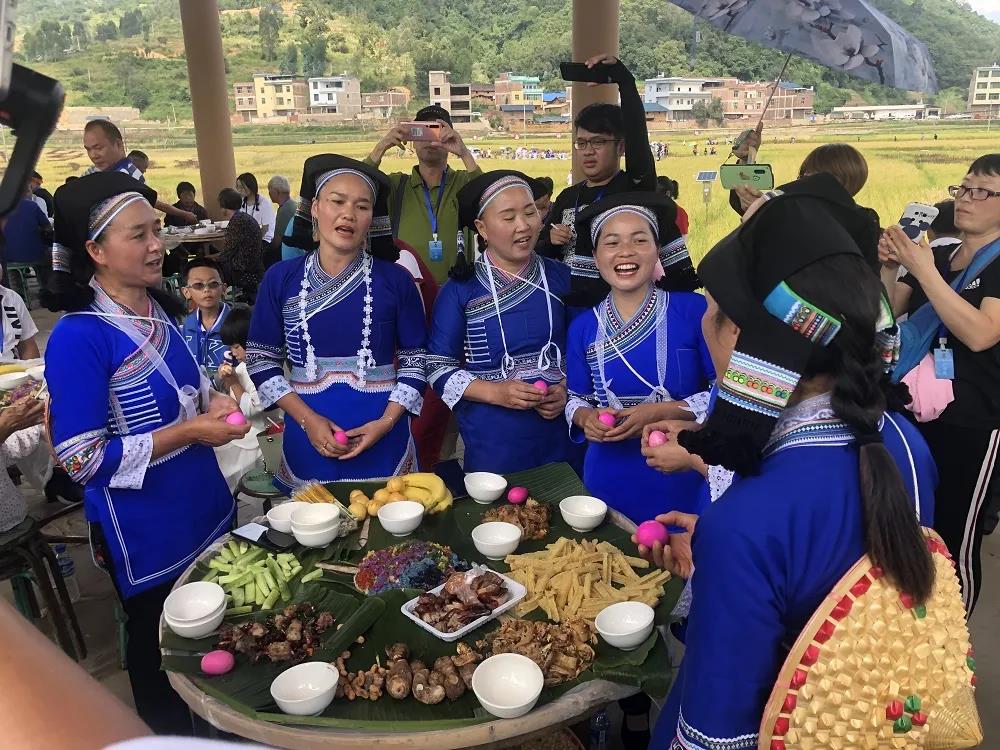 國家繁榮昌盛,人民生活幸福日子甜美。中午時分,現(xiàn)場壯鄉(xiāng)長桌簸箕宴盛裝開席。喜悅的群眾對造型精巧、美妙絕倫的桑秋花米飯及平寨特色美食贊不絕口。一個個簸箕盛放的不僅是原生態(tài)健康美味,更是丘北壯鄉(xiāng)沉淀千年的魅力文化象征。
