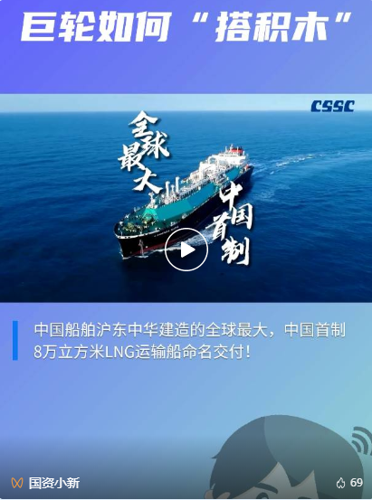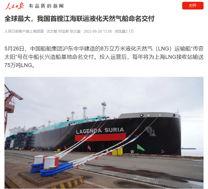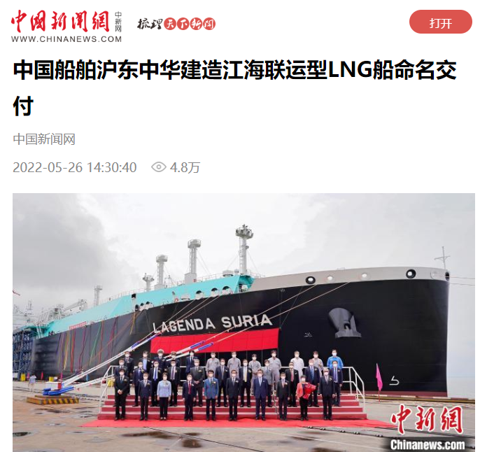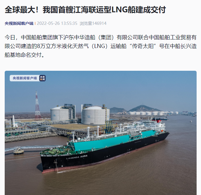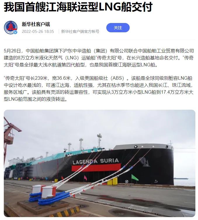 5月26日,中國(guó)船舶集團(tuán)旗下滬東中華聯(lián)合中船貿(mào)易建造的8萬(wàn)立方米液化天然氣(LNG)運(yùn)輸船“傳奇太陽(yáng)”號(hào)在長(zhǎng)興造船基地命名交付?!皞髌嫣?yáng)”號(hào)是全球最大淺水航道第四代、我國(guó)首款首制首艘江海聯(lián)運(yùn)型LNG船,填補(bǔ)了中國(guó)淺水航道LNG船的空白,在該細(xì)分市場(chǎng)占有率最高,有望成為中國(guó)船舶制造的又一精品船型。
