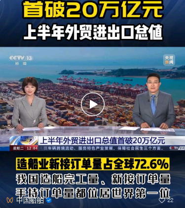 7月18日,央視《新聞30分》年中外貿(mào)觀察鏡頭再次對準(zhǔn)火熱的造船市場,在出口面臨較大外需壓力的背景下,上半年,中國外貿(mào)頂住了壓力、穩(wěn)住了規(guī)模、提升了質(zhì)量,既呈現(xiàn)出“韌性”底色,又展現(xiàn)了多種“新”的成色。