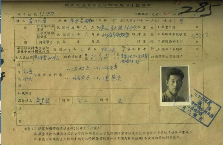 “國立交通大學(xué)”這所當(dāng)時在科學(xué)技術(shù)領(lǐng)域全國首屈一指的學(xué)術(shù)殿堂,在黃旭華心中是神圣而遙遠的。以至于當(dāng)真正有機會填寫被保送大學(xué)的名字時,他竟然沒有勇氣填上“國立交通大學(xué)”的名字,只填上了一個中央大學(xué)的航空系。