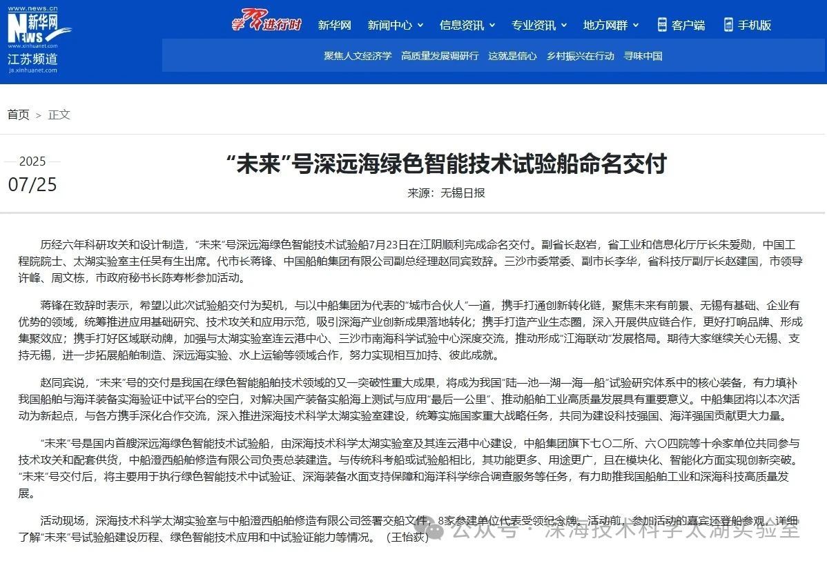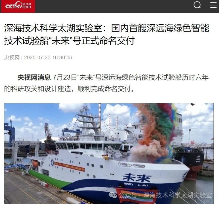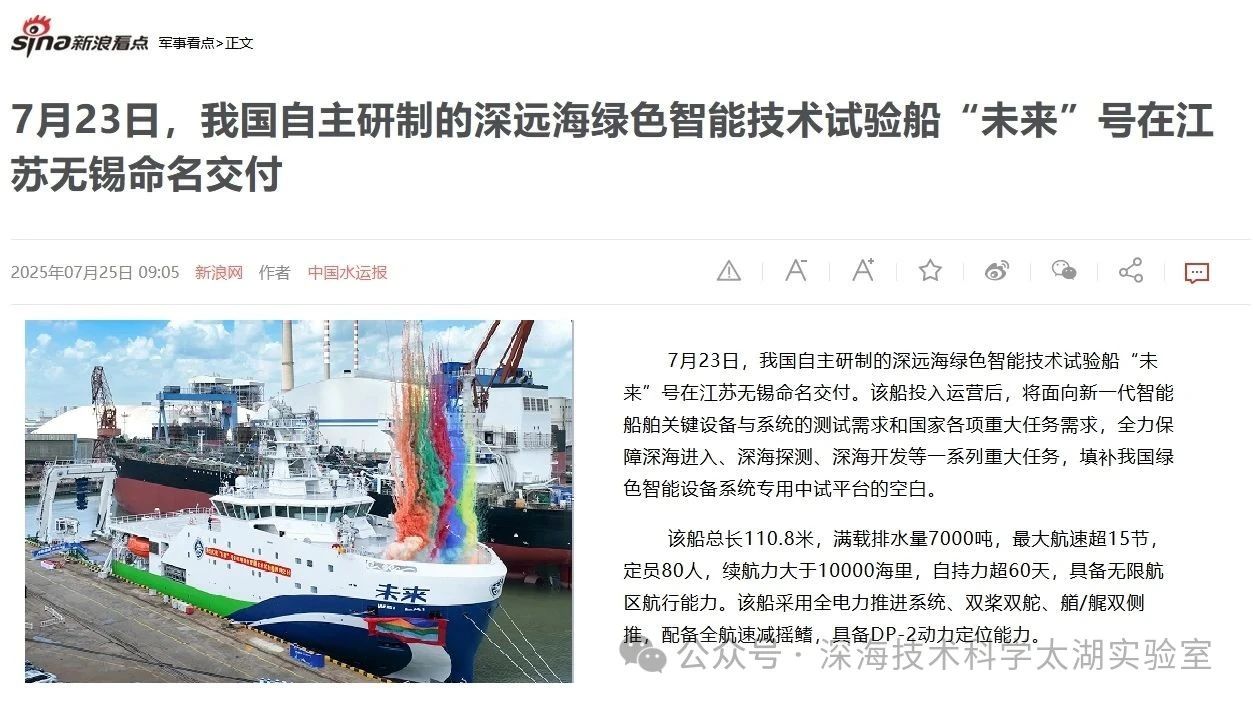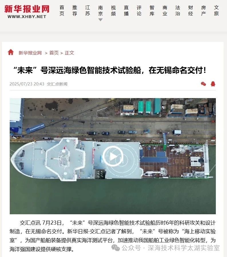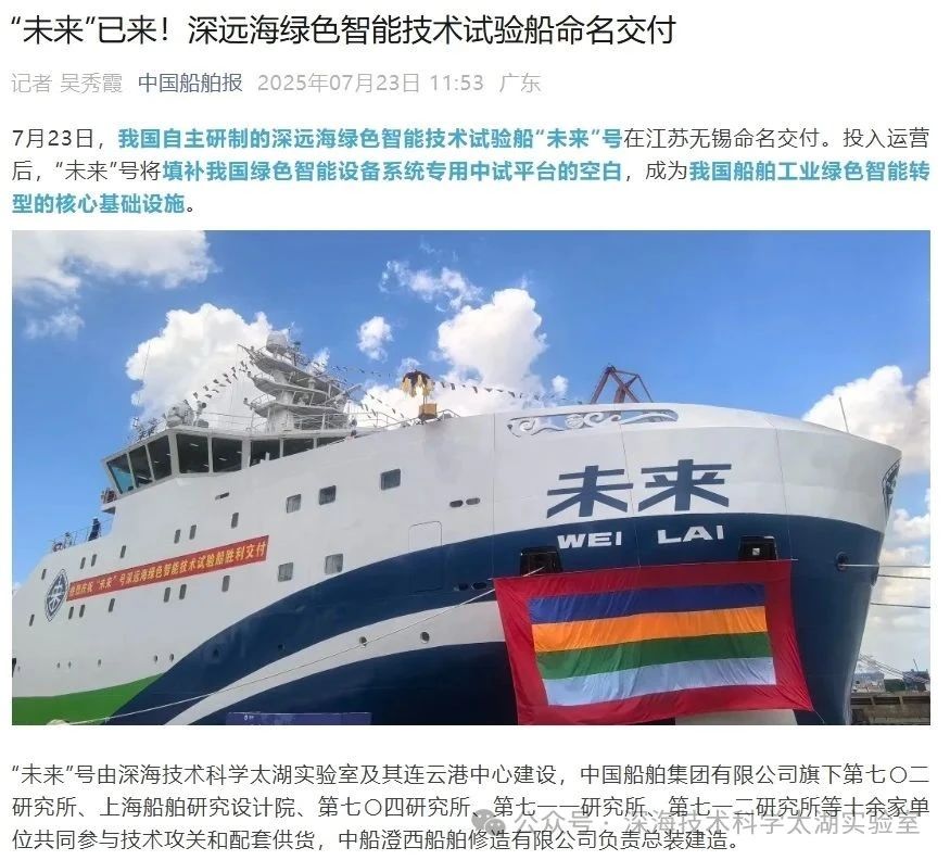 7月23日,由深海技術(shù)科學(xué)太湖實(shí)驗(yàn)室歷時(shí)六年科研攻關(guān)和設(shè)計(jì)建造的“未來(lái)”號(hào)正式命名交付。中船集團(tuán)旗下七〇二所、上船院、七〇四所、七一一所、七一二所等十余家單位共同參與技術(shù)攻關(guān)和配套供貨,中船澄西負(fù)責(zé)總裝建造人民日?qǐng)?bào)、新華社、央視新聞、科技日?qǐng)?bào)等主流媒體共同聚焦這一“國(guó)之重器”。