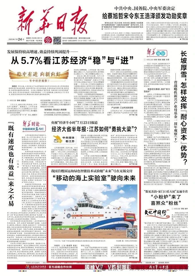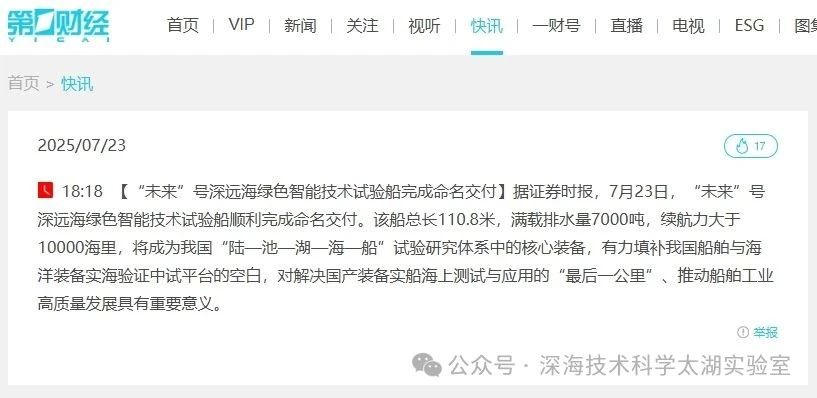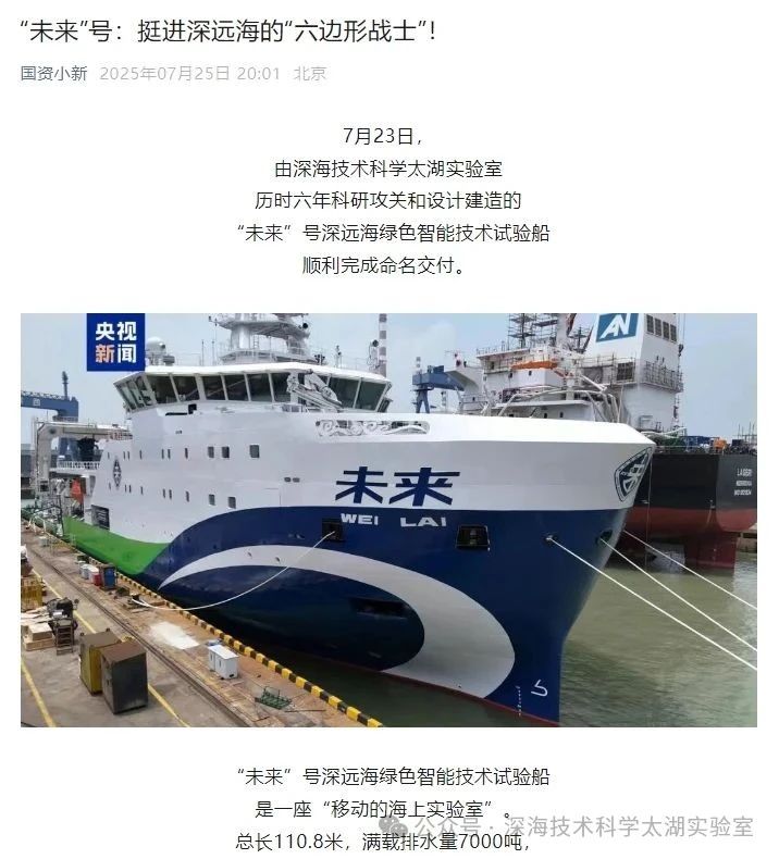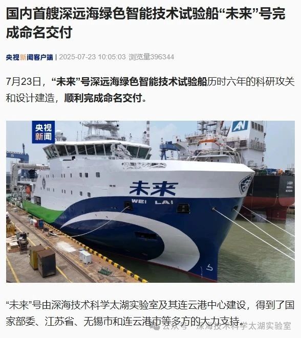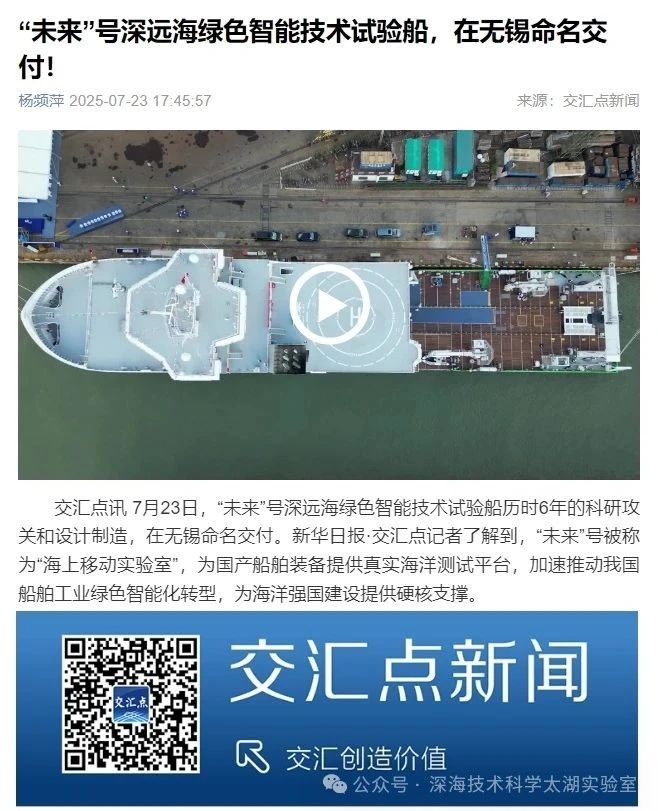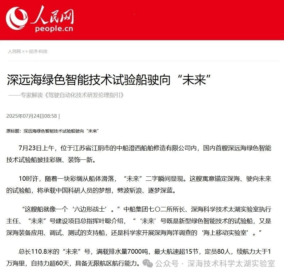 7月23日,由深海技術(shù)科學(xué)太湖實(shí)驗(yàn)室歷時(shí)六年科研攻關(guān)和設(shè)計(jì)建造的“未來(lái)”號(hào)正式命名交付。中船集團(tuán)旗下七〇二所、上船院、七〇四所、七一一所、七一二所等十余家單位共同參與技術(shù)攻關(guān)和配套供貨,中船澄西負(fù)責(zé)總裝建造人民日?qǐng)?bào)、新華社、央視新聞、科技日?qǐng)?bào)等主流媒體共同聚焦這一“國(guó)之重器”。