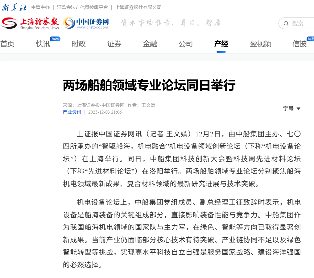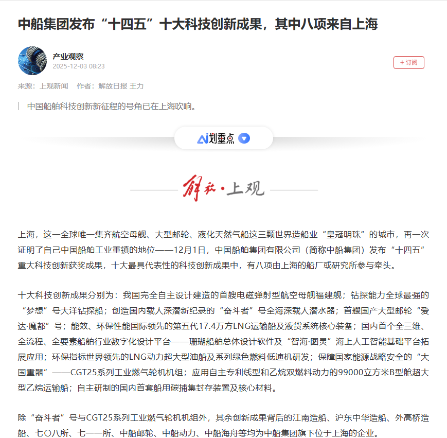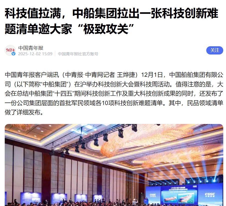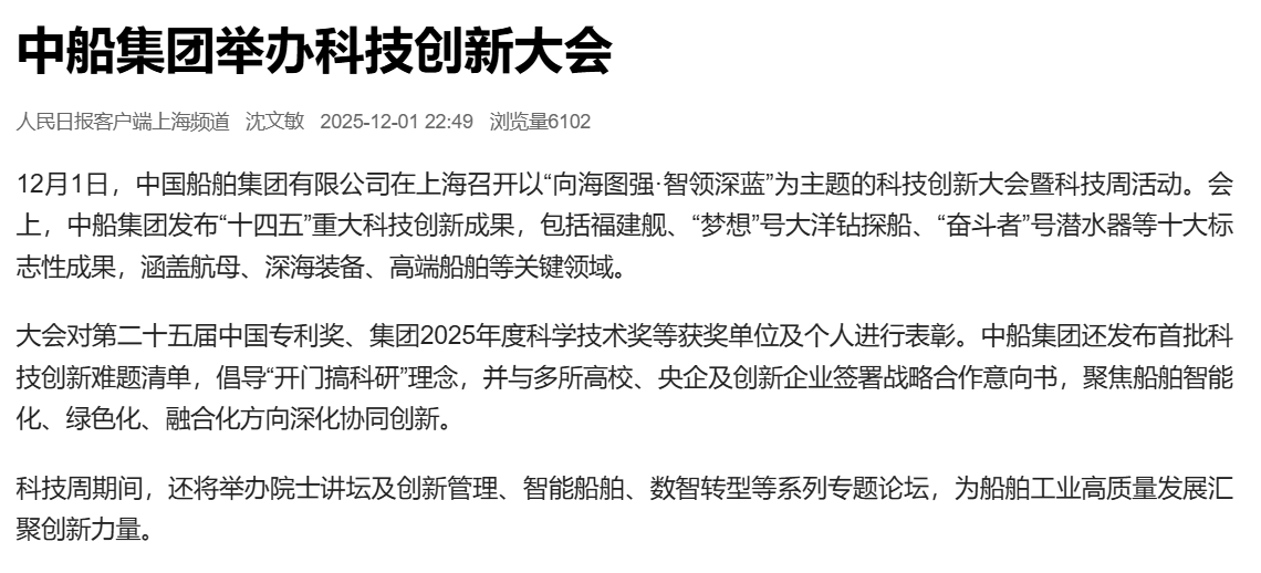此次大會(huì)聚焦“向海圖強(qiáng)·智領(lǐng)深藍(lán)”主題,系統(tǒng)總結(jié)了中船集團(tuán)“十四五”期間科技創(chuàng)新工作及重大科技創(chuàng)新成果,謀劃“十五五”科技發(fā)展規(guī)劃,引發(fā)中央、行業(yè)及地方媒體的廣泛關(guān)注報(bào)道。